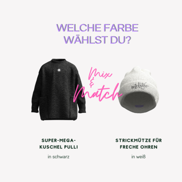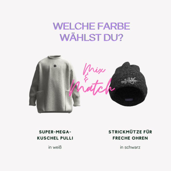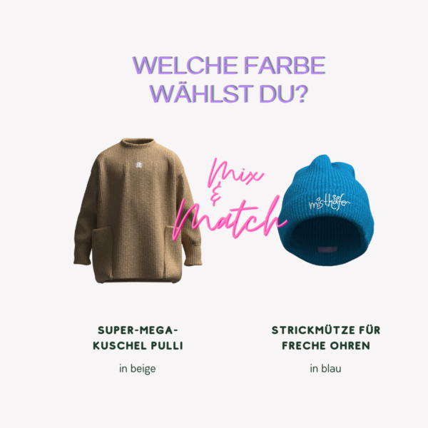 Ein Set, viele Möglichkeiten: Das Kinder-Kuschel-Set lädt zum Mix & Match ein – kombiniert den Pullover mit der Mütze und schafft so den Stil der zu eurem kleinen mistkäfer passt.